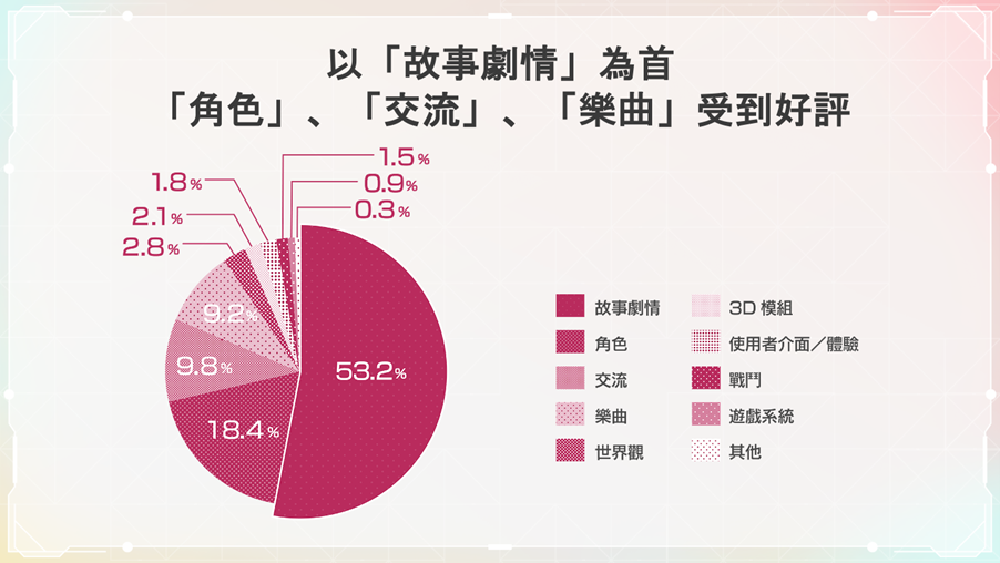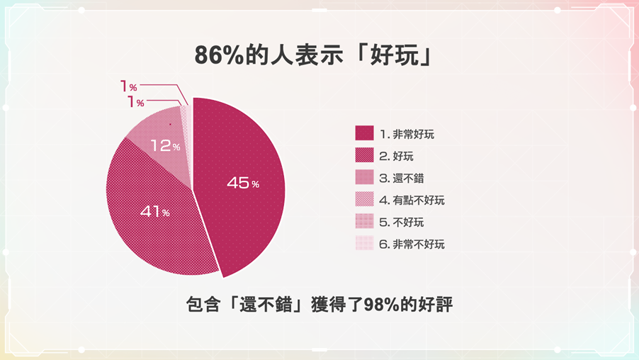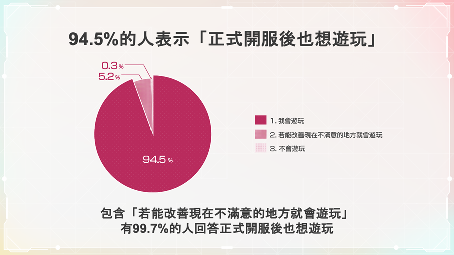 此外,高達94.5%的玩家表示「正式開服後仍想繼續玩」,而回答「改善遊戲內缺點後會想玩」之玩家比例為99.7%。針對「遊戲中最有趣之處」,多數玩家則回答「故事劇情」、「角色」、「交流」、「樂曲」等。而包含翻譯、在地化等,玩家們給予團隊許多寶貴的意見。