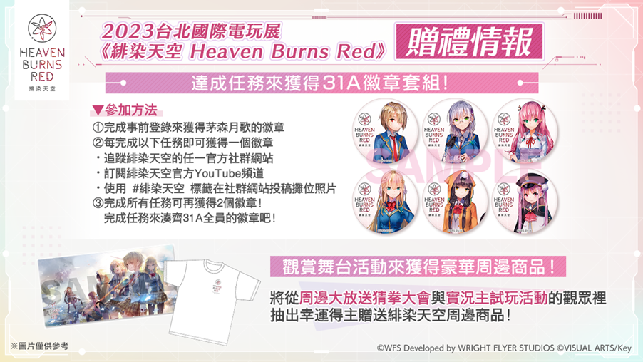 台北國際電玩展期間,多位人氣Coser將扮演遊戲中31A部隊的主要角色,並將於2月4日(六)、5日(日)兩天,在攤位上和玩家互動。官方亦準備了許多獎品要送給前來攤位的玩家們,在攤位秀出完成事前登錄的畫面,就能獲得巴哈姆特封印任務的過關印章,而完成指定任務,更能一次蒐集31A部隊全套徽章。還將從周邊大放送猜拳大會與實況主試玩活動的觀眾裡,抽出幸運得主贈送緋染天空周邊商品!