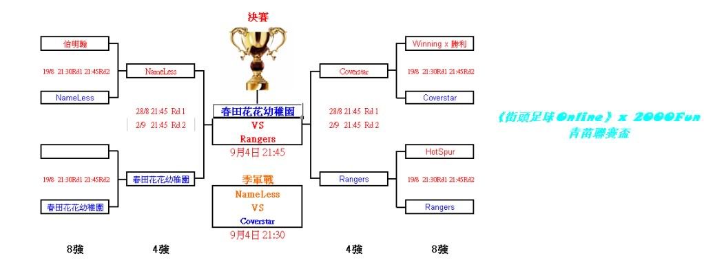 最後第五屆2000fun街頭足球聯賽終於結束,感謝各單位幫助和球會的支持,而下屆聯賽應該係第2位人搞,謝謝.