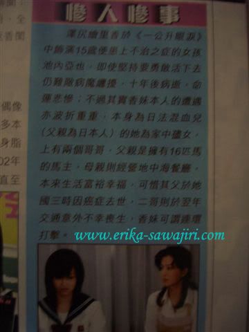 另外,澤尻的人氣同時直逼香港。其成名作《一公升眼淚》日前緊接《女王的教室》登陸本港,雖然收視僅錄得20點,仍無阻她夥拍型男小栗旬主演的驚慄片《鉄道凶靈》(前譯:《恐怖失物》)下月在港上映。而她與柳樂優彌及陳柏霖合作的《風味絕佳》,同時暫定明年一月在港開畫。