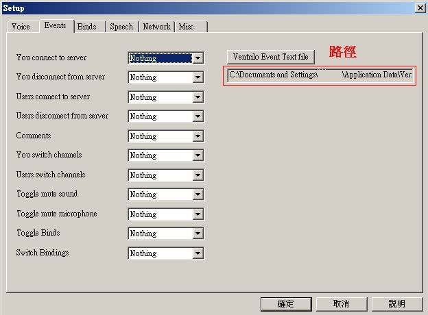 1. 參照你Ventrilo的setup->Events裡面的路徑(如圖1的指示)