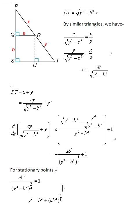 It desired to carry a long thin rod down a corridor [ b ] feet wide and around a square corner into another corridor [ a ] feet wide. What is the longest rod with which this can be managed if the rod is kept horizontal and is never bent?
