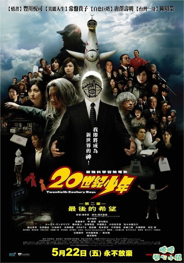《20世紀少年》為浦澤直樹原作的科學冒險漫畫,於1999年至2006年連載,並獲得無數獎項。電影版以三部曲形式製作,製作費耗資60億,動員300位演員參與演出。導演為《自虐之詩》堤幸彥,唐澤壽明飾演男主角遠藤賢知、豐川悅司飾演阿區、常盤貴子飾演雪次,以及香川照之、黑木瞳、佐野史郎、佐佐木藏之介等超豪華陣容合演。