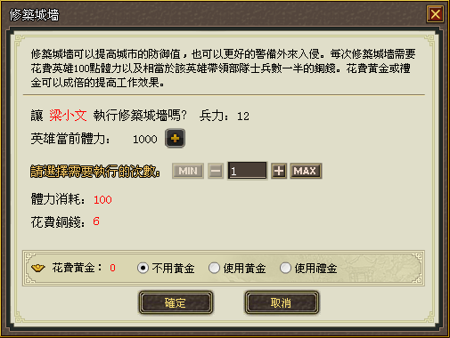| 城門: | 修築城牆:提高當前城池發生戰鬥時,本國部隊的防禦力。同時, 城防越高就能越早發現敵國對本城池的軍事攻擊。