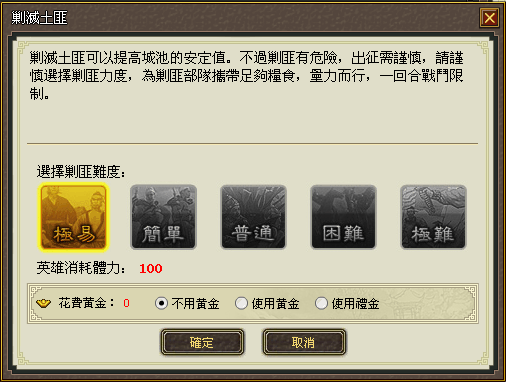選擇英雄部隊執行。分極易、簡單、普通、困難、極難五個檔次,且每個難度檔次都有一定幾率出現傳奇英雄,分別消耗100、150、200、250、300點英雄體力。土匪NPC只攜帶四個陣位的兵力,方便攜帶運輸兵種進行連續剿匪。全滅土匪的隨機獎勵中將有幾率獲得貨票。