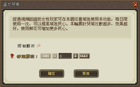 民心提升:剿滅土匪、修築城牆、修繕道路、孟薑哭城(只有通過視頻認證的女性玩家才能使用此功能,時間為每天一次,不需間隔24小時,哭城提升民心值,哭城次數越多,每次提升的民心也隨次數增加)