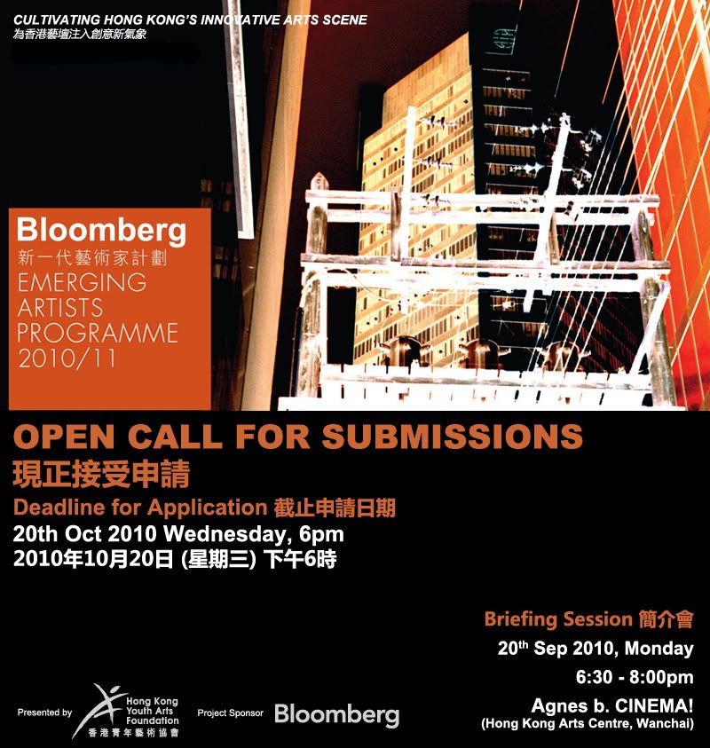 Organised by the Hong Kong Youth Arts Foundation (YAF), the Bloomberg Emerging Artists Programme is a unique opportunity for an emerging artist / group to receive funding and supports in their creation of innovative art (including performing arts). The programme provides a three-month residency period, including grant money and living allowance, for the selected artist / group to develop their work, culminating in an exhibition or performance for the public. For more information and details about application, please visit HKYAF website or come to our Briefing Session on Sep 20 6"30pm - 8:00pm at Agnes b. CINEMA! (RSVP is needed)!