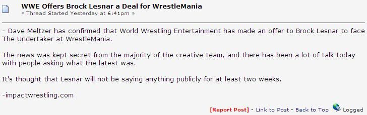 [討論] 有消息指 WWE 已出價邀請 Brock Lesnar 於 Wrestlemania 27 出賽對戰 Undertaker, 大家點睇? [複製鏈接] |