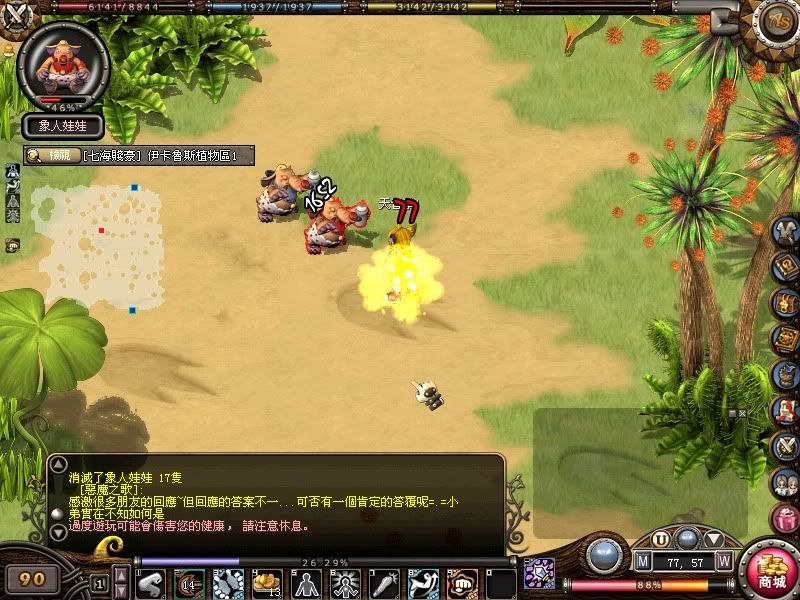 打象人寶寶(80級的怪) 試過3隻怪站在一起, 天音拳一射過去, 3個數字向上升起....miss, miss, miss