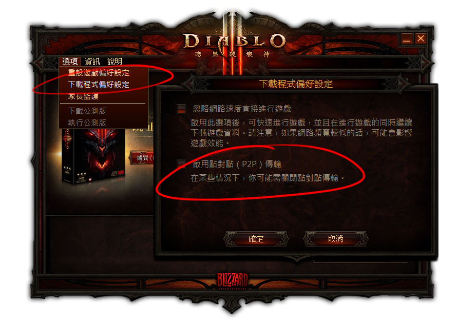 - 連線出問題:學網或網速不佳的板友可能有此問題(也可能你網路十分正常,單純就是跟暴雪犯衝),這比較難一勞永逸、百分之百的解決,可以先嘗試將點對點功能關閉試試。執行啟動器後選擇上方「選項--下載程式偏好設定」,並取消「啟用點對點(P2P)傳輸」之勾選,按下確定。