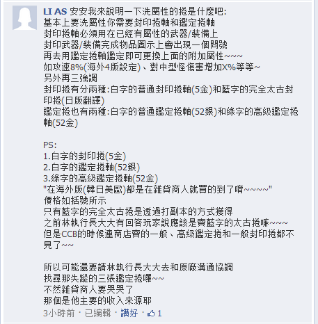 林一泓 to LI AS: 這部分的玩法原廠變更頗多, 但是沒有以前那樣複雜, 詳細內容(偶也尚不太清楚)大家可以看日後官網的公告說明, 也可以自己親身嘗試過後跟大家分享喔~ 另外我知道遊戲中npc是有賣鑑定與封印, 只是商城賣的是給名品專用的, 但是名品仍然是遊戲中的寶, 台版必須要靠玩家自己打到(會綁定), 國外版本是可以洗成名品(台版無), 若國外部分有說錯還請指正喔