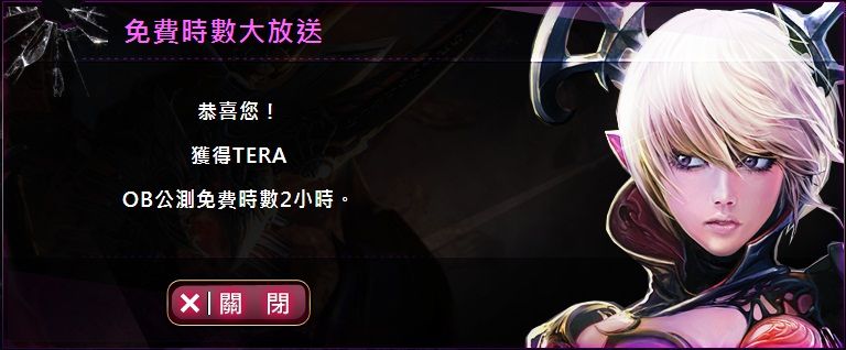 (4)參與過CCB的玩家 無須登記便可參與CB 於10/31(三)12:00~11/7(三)23:59 期間以「OMG帳號(如綁定)」或「CCB序號」 登記領取免費時間(網址請按我),最少會獲得2小時OB時數 http://tera.omg.com.tw/event/20121024/PreOrderGetOBActivate.aspx