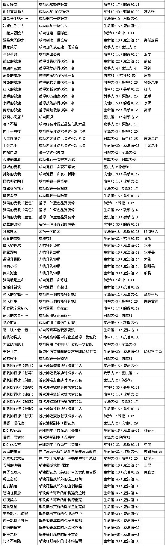 小小冒險王成就稱號獎勵一覽 成就稱號玩法將成為小小冒險王最為大型也最為深入人心的玩法,此玩法種類繁多,近乎可以無限擴展。 簡單說來,即為玩家完成某種特定的條件,獲得某項成就,該成就獎勵給玩家一些屬性及稱號獎勵。 成就分為副本成就、競技成就、社交成就、其他成就4種。 成就則默認開啟。達到條件後,自動獲得該成就獎勵。 玩家獲得多個成就稱號後,只能選擇1種稱號掛在頭上,各個成就獎勵屬性在獲得後即作為基本屬性,不需要啟動成就以加成。 已經完成的成就,不能反復完成。 玩家可在成就面板中查看到所有已開放的成就內容及獎勵,同時也可在成就面板中,查看到自己成就完成情況。 成就列表: