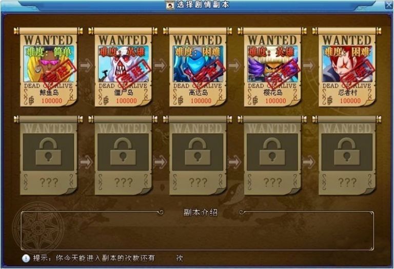 同一個劇情副本分為簡單-普通-困難-英雄4個級別,除簡單難度外建議組隊進入副本,越高難度的副本產出的貝利、道具品級也會越高,要開啟更高難度的副本需要把前面一個難度的副本打通並達到要求的副本通關評分後即可開通,想要開通新的劇情副本需要把前面副本的普通難度完成並達到要求的副本通關評分後即可開通。