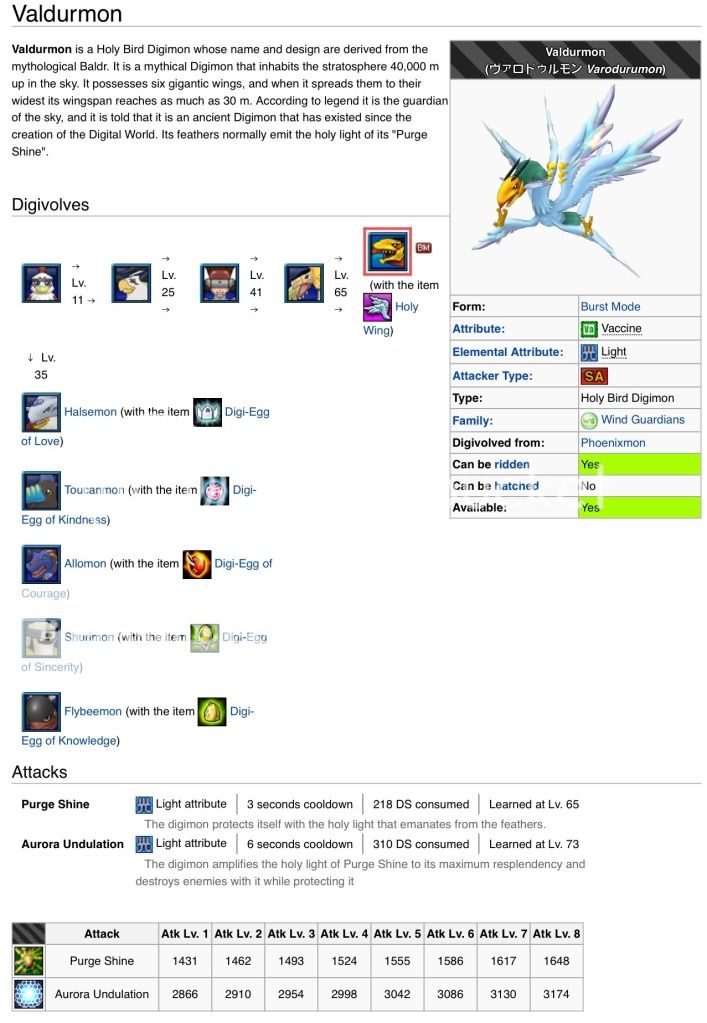在高空40,000米的平流層生活的幻之聖鳥型數碼獸。 擁有6張巨大的羽翼,翅膀張開時的最大翼展可達30米。傳說中天空的守護者,在數碼世界創世時便存在的古代種數碼獸。瓦爾德獸的羽毛平時總散射出神聖的光芒“淨化之光”,擁有邪惡思念的攻擊會100%無效化,如同保護壁般包圍著身體。必殺技是將“淨化之光”最大增幅釋放的“極光波動”。據說這個技能擁有粉碎星辰的威力,因為是以光速放出的所以基本上是不可能回避的。