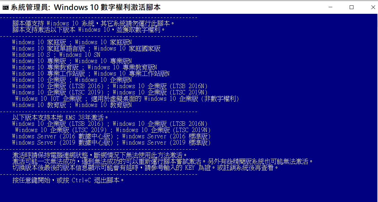 腳本目前支持家庭版、專業版、教育版、企業版等19個版本數字激活。,